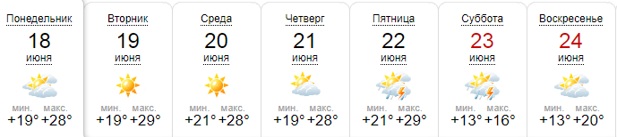 По данным сайта Sinoptik.ua, считает, что гроза будет в пятницу и субботу. Дневная температура +28...+29. В воскресенье столбик термометра днем опустится до +22.