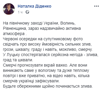"На северо-западе Украины, на Волыни, Ровенской области сейчас чрезвычайно активная атмосфера. Красные ячейки на спутниковом фото свидетельствуют о высокой вероятности сильных ливней, грозы, шквала, града и даже, возможно, смерча", написала она.