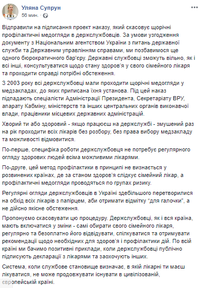 "Отправили на подписание проект приказа, отменяющего ежегодные профилактические медосмотры госслужащих. При условии согласования документа с Нацагентством Украины по вопросам госслужбы и Государственным управлением делами, мы лишимся еще одного бюрократического барьера. Государственные служащие смогут свободно, как и все остальные, консультироваться относительно состояния здоровья у своего семейного врача и проходить действительно нужные обследования", – отметила Супрун.