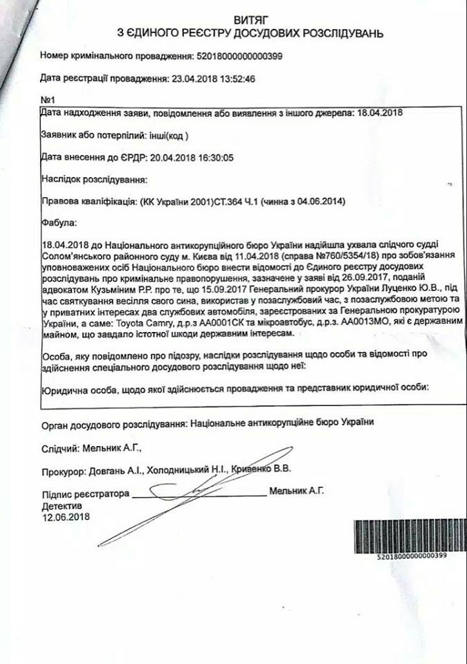 Пришлось через суд заставить розовощеких антикоррупционеров Сытника и Холодницкого расследовать очевидный факт коррупции генпрокурора. Публикую выписку из ЕРДР и письмо детектива НАБУ о начале расследования дела против генпрокурора, перепутавшего таксопарк и автопарк подчиненной ему ГПУ.