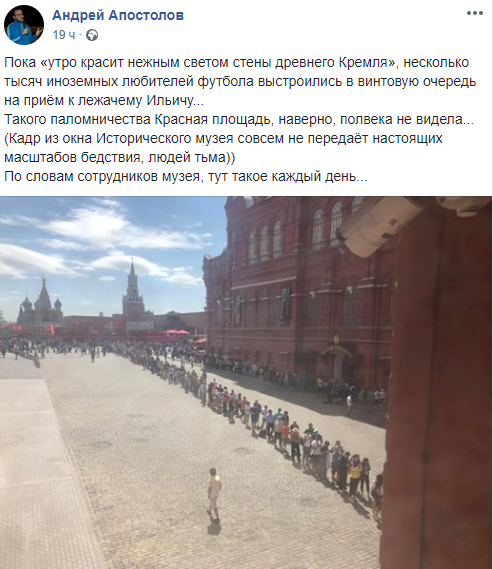 О том, что тысячи болельщиков хотят попасть в Мавзолей, Апостолов написал в Facebook.