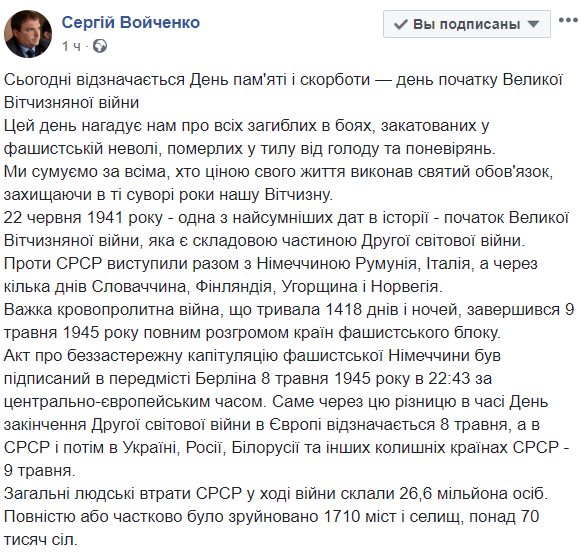 Мы скорбим по всем, кто ценой своей жизни выполнил святой долг, защищая в те суровые годы наше Отечество", – говорит адвокат Сергей Войченко.