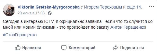 Также в еще одном сообщении она пишет, что "...если что-то случится со мной или моими близкими - это произойдет по заказу Антон Геращенко!".