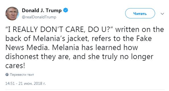 "Надпись "Меня это вообще не трогает. А вас?" на куртке Мелании касается фейковых СМИ. Мелания уже узнала, какие они нечестные, и ее это действительно больше не волнует!" - написал президент в своем Twitter.