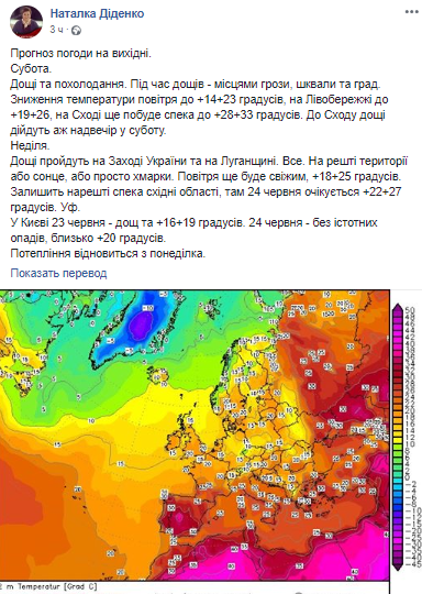 "На остальной территории или солнце, или просто облака. Воздух еще будет свежим, + 18 + 25 градусов. Оставит наконец жара восточные области, там 24 июня ожидается + 22 + 27 градусов", - написала синоптик.