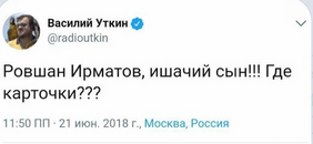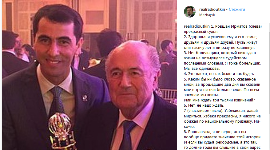 Так, например, известный спортивный обозреватель Василий Уткин, во время матча разместил в своем Twitter оскорбительное сообщение: "Равшан Ирматов, ишачий сын!!! Где карточки???".