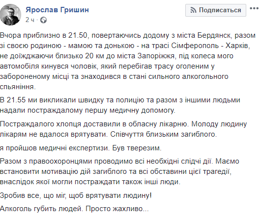 Депутат Запорожского облсовета Ярослав Гришин сбил мужчину на трассе Симферополь-Харьков, пострадавший скончался. Об этом депутат сообщил на своей странице в Facebook.
