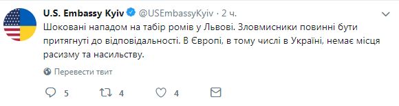 "Шокированы нападением на лагерь ромов во Львове. Злоумышленники должны быть привлечены к ответственности. В Европе, в том числе в Украине, нет места расизму и насилию", - сообщает посольство.