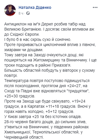 "Завтра на Западе ожидаются дожди, которые распространятся на Житомирскую и Винницкую. И еще может пойти дождь в районе Приазовья. Большинство областей построят во вторник в сухом воздухе.