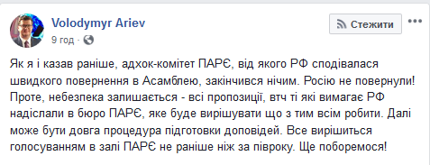 "Как я и говорил ранее, комитет ПАСЕ, от которого РФ ждала скорейшего возвращения в Ассамблею, закончился ничем. Россию не вернули! Однако, опасность остается - все предложения, в том числе и те которые требует РФ - направили в бюро ПАСЕ, которое будет решать, что с тем всем делать. Далее может быть длинная процедура подготовки докладов. Все решится голосованием в зале ПАСЕ не раньше чем через полгода. Еще поборемся!", - написал Арьев.