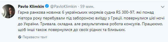"Хорошая утренняя новость: 6 украинских моряков судна RS 300-97, которые более полутора лет находились под запретом выезда из Греции, вернулись этой ночью. Длительная, сложная, но результативная работа консулов", - написал он.