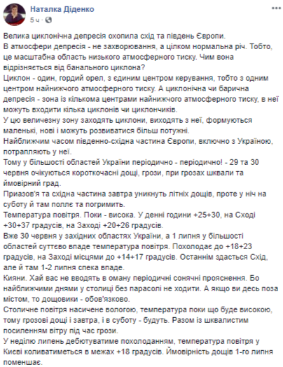 "У атмосферы депрессия - не заболевание, а вполне нормально. То есть, это масштабная область низкого атмосферного давления. Чем она отличается от банального циклона? Циклон - один, гордый орел, с единым центром управления, то есть с одним центром низкого атмосферного давления. А циклоническая или барическая депрессия - зона с несколькими центрами низкого атмосферного давления, в нее могут входить несколько циклонов или циклончиков. В эту огромную зону заходят циклоны, выходят из нее, формируются маленькие, новые и могут развиваться более мощные. В ближайшее время юго-восточная часть Европы, включая Украину, попадают в нее. Поэтому в большинстве областей Украины периодически  - 29 и 30 июня ожидаются кратковременные дожди, грозы, при грозах шквалы и вероятный град", - пишет Диденко.