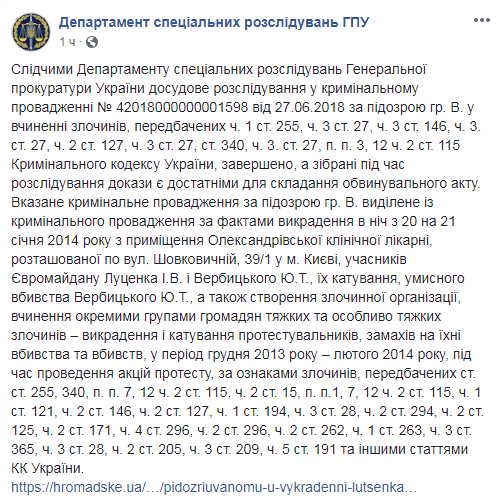 Подозреваемому Александру Волкову инкриминируют похищение Луценко и Вербицкого в ночь с 20 на 21 января 2014 из помещения Александровской клинической больницы, их истязание, умышленное убийство Вербицкого, а также создание преступной организации, совершение отдельными группами граждан тяжких и особо тяжких преступлений - похищение и пытки протестующих, покушения на их убийства и непосредственно - убийства.