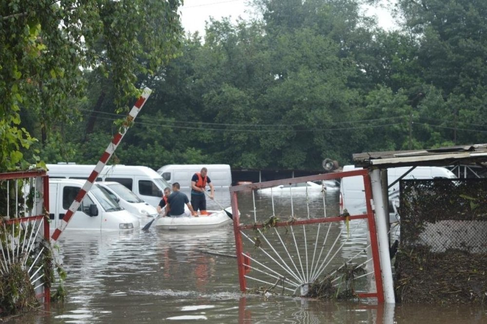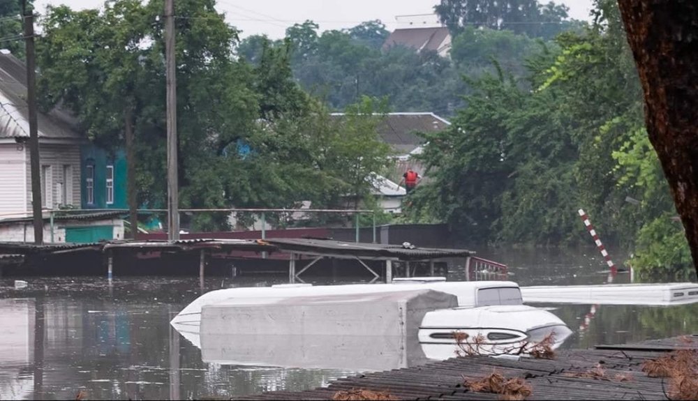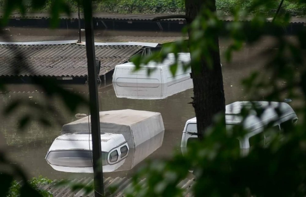 На одной из улиц затопило парковку, поэтому там виднеются только верхушки микроавтобусов и небольших грузовиков.