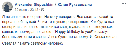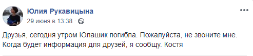 В частности, в пятницу, 30 июня на ее странице в соцсети появилось следующее сообщение: "Друзья, сегодня утром Юлашик погибла. Пожалуйста, не звоните мне. Когда будет информация для друзей, я сообщу. Костя".