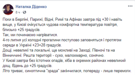"Так, мы начинаем нагреваться. 4 июля все холодные пробелы постепенно заполнятся и в течение среды в Украине + 23 ...+ 28 градусов. Дожди, небольшие и локальные, еще возможны на Западе, Севере и в Винницкой области. Остальная территория - сухо, малооблачно, солнечно. В Киеве завтра без существенных осадков, только в отдельных районах небольшой дождь. Днем до +25 градусов. Лето продолжается, синоптическая "измена" закончилась, впереди - только победы," - написала она.