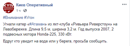 "Угнали катер Атаман из яхт-клуба Ривьера Риверстоун на Левобережке. Длина 9,5 м, ширина 3,2 м. Год выпуска 2007, 2 подвесных мотора Honda-225, 330 кВт. Вдруг кто увидит на воде или у берега, просьба сообщить"- говориться в сообщении.