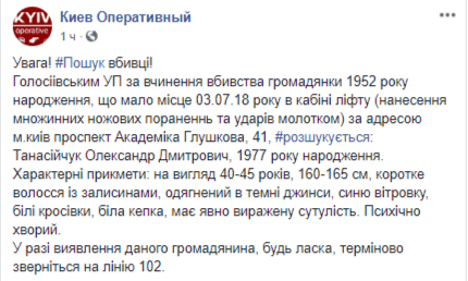 "За совершение убийства гражданки 1952 года, что имело место 03.07.18 года в кабине лифта (нанесение множественных ножевых ранения и ударов молотком) по адресу г.Киев проспект Академика Глушкова, 41, # разыскивается: Танасийчук Александр Дмитриевич, 1977 года рождения", - говорится в сообщении.