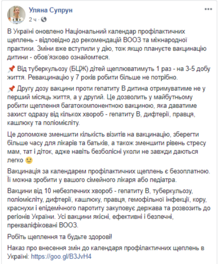 Кроме того, на странице Супрун разместила ссылки на приказ о внесении изменений в календарь профилактических прививок в Украине и сам обновленный календарь.