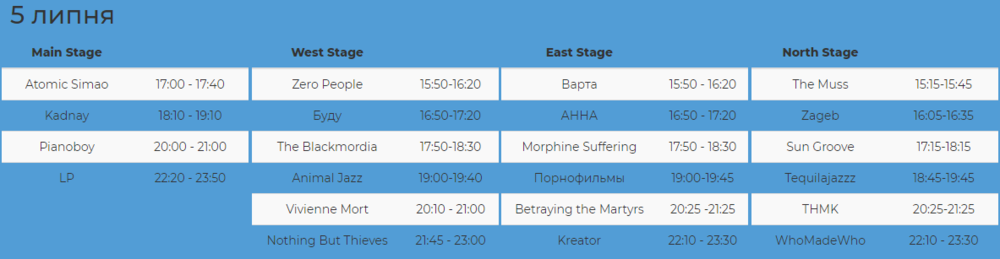 Как и в остальные дни продолжают работать семь сцен фестиваля. На главной сцене, кроме LP, сегодня выступят Atomic Simao, Kadnay, Pianoboy.