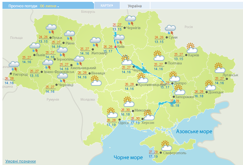 В ближайшие сутки, 6 июля, погоду запада и севера Украины будет определять теплая и неустойчивая воздушная масса, юго-восточная половина будет находиться в сухом и жарком воздухе, сообщает Гидрометцентр.