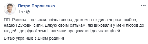 "Семья - это извечная опора, где каждый человек черпает любовь, надежду и духовные силы. Благодарю своих родителей, которые воспитали во мне любовь к людям и к родной земле, научили работать и достигать целей. Поздравляю украинский с Днем семьи!" - написал Порошенко.