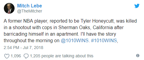 "Бывший игрок НБА, которым, как сообщается, был Тайлер Ханникат, был убит в перестрелке в Шерман-Окс, Калифорния, после того как забаррикадировался в доме", - написал он в Twitter.