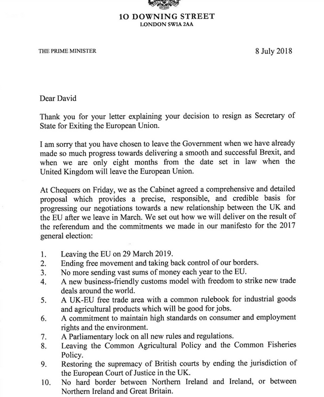 В Британии министр по вопросам выхода из Евросоюза Дэвид Дэвис устроил демарш против премьера Терезы Мэй и подал в отставку. Тереза Мэй в своем письме уже заявила, что с сожалением отнеслась к этой отставке.