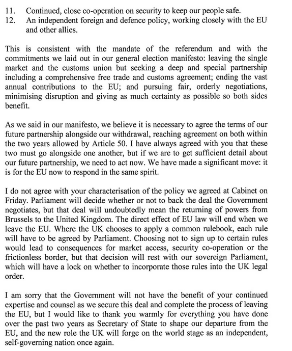 Поблагодарив в письме Дэвиса за проделанную работу на министерском посту, премьер подчеркнула: "Я не согласна с вашей характеристикой той политики, которую мы согласовали на заседании кабинета министров в пятницу. Парламент решит, поддерживать или нет соглашение, по которому правительство ведет переговоры, но эта сделка (с ЕС об условиях Brexit), вне всяких сомнений, будет означать возвращение полномочий от Брюсселя к Соединенному Королевству. Непосредственное действие законодательства ЕС завершится, когда мы покинем ЕС", - констатировала глава правительства.
