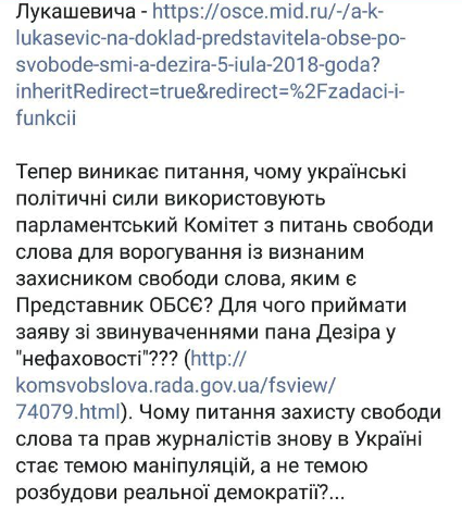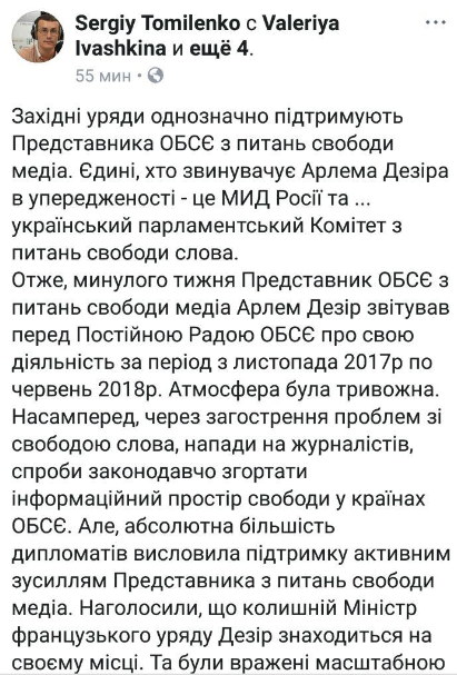 Теперь возникает вопрос, почему украинские политические силы используют парламентский Комитет по вопросам свободы слова для вражды с признанным защитником свободы слова, каков и есть Представитель ОБСЕ? Для чего принимать заявления с обвинениями господина Дезире в "непрофессионализме"?", - написал Сергей Томиленко.
