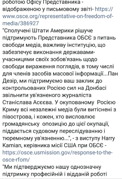 "Соединенные Штаты Америки решительно поддерживают Представителя ОБСЕ по вопросам свободы СМИ, важный институт, обеспечивающий выполнение государствами-участниками своих обязательств по свободе слова, в том числе для членов средств массовой информации ...Господин Дезир, мы поддерживаем ваш призыв к контролируемым Россией силам на Донбассе освободить заключенного журналиста Станислава Асеева. В оккупированном Россией Крыму все независимые СМИ были вытеснены с полуострова и каждый, кто выражает гражданскую оппозицию к этой оккупации, подвергается судебному преследованию и тюремному заключению... ", - выступил Гарри Камиан, руководитель миссии США при ОБСЕ.