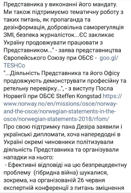 "Мы подтверждаем нашу однозначную поддержку профессиональной и преданной работе Представителя в исполнении его мандата. Мы также поддерживаем тематическую работу по таким вопросам, как пропаганда и дезинформация, добровольная саморегуляция СМИ, безопасность журналистов. ЕС призывает Украину продолжать работать с Представителем" - с таким заявлением выступило представительство Европейского Союза при ОБСЕ.