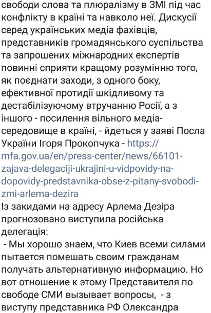 "Западные правительства однозначно поддерживают представителя ОБСЕ по вопросам свободы СМИ. Единственные, кто обвиняет Арлем Дезире в предвзятости - это МИД России и ... украинский парламентский Комитет по вопросам свободы слова.