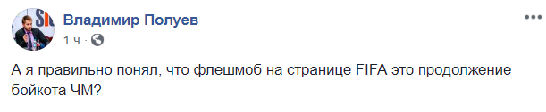 "А я правильно понял, что флешмоб на странице FIFA это продолжение бойкота ЧМ?", - спрашивает журналист Владимир Полуев.
