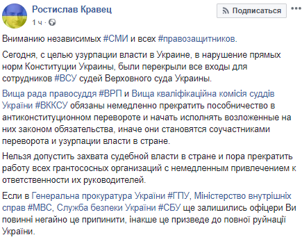 Об этом сообщает адвокат Ростислав Кравец на своей странице в Facebook.