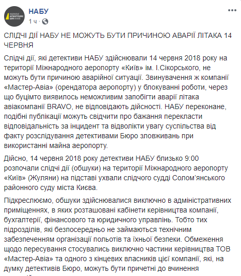 НАБУ подтверждает, что 14 июня, в день аварии самолета авиакомпании Bravo, детективы бюро проводили обыски на территории аэропорта.