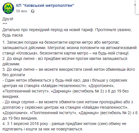 "До конца июля - вы можете использовать синий жетон обменяв его без доплаты. Один жетон обменивается в любой кассе, два и более в сервисных центрах на станциях "Майдан Независимости", "Дорогожичи", "Политехнический институт", "Дарница" (вестибюль № 2) с 8 до 19 без выходных. К концу августа - вы можете обменять синие жетоны пропорционально или с доплатой в сервисных центрах на станциях "Майдан Независимости", "Дорогожичи", "Политехнический институт", "Дарница" (вестибюль № 2) с 08.00 до 19.00 без выходных", - говорится в сообщении.