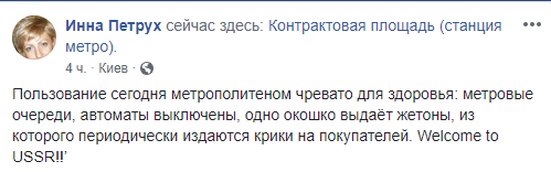 "Пользование сегодня метрополитеном чревато для здоровья: метровые очереди, автоматы выключены, одно окошко выдаёт жетоны, из которого периодически издаются крики на покупателей. Welcome to USSR!"? - написала Инна Петрух.