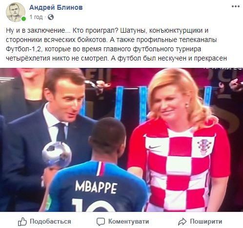 "Кто проиграл? Шатуны, конъюнктурщики и сторонники всяческих бойкотов. А также профильные телеканалы Футбол-1,2, которые во время главного футбольного турнира четырёхлетия никто не смотрел. А футбол был нескучен и прекрасен", - пишет журналист Андрей Блинов.