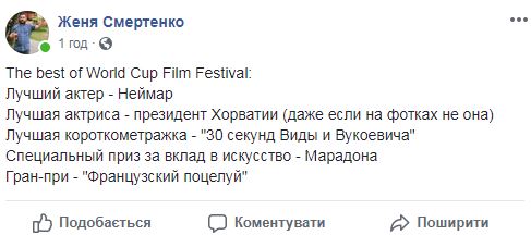"The best of World Cup Film Festival: Лучший актер – Неймар; Лучшая актриса - президент Хорватии (даже если на фотках не она); Лучшая короткометражка - "30 секунд Виды и Вукоевича"; Специальный приз за вклад в искусство – Марадона; Гран-при - "Французский поцелуй", - раздал свои "премии" спортивный журналист Евгений Смертенко.