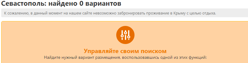 Система выдает сообщение: "К сожалению, в данный момент на нашем сайте невозможно забронировать проживание в Крыму с целью отдыха".