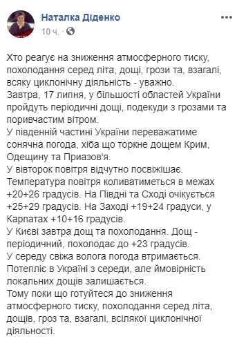 Завтра, 17 июля, в Украине похолодает, в большинстве областей Украины пройдут периодические дожди, местами с грозами и порывистым ветром. Об этом сообщила синоптик Наталья Диденко у себя в Facebook.