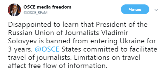 "Разочарован, узнав, что председателю Союза журналистов России Владимиру Соловьеву, запрещен въезд в Украину сроком на три года, - написал Дезир. - Страны ОБСЕ привержены тому, чтобы способствовать поездкам журналистов. Ограничения на поездки влияют на свободное распространение информации".