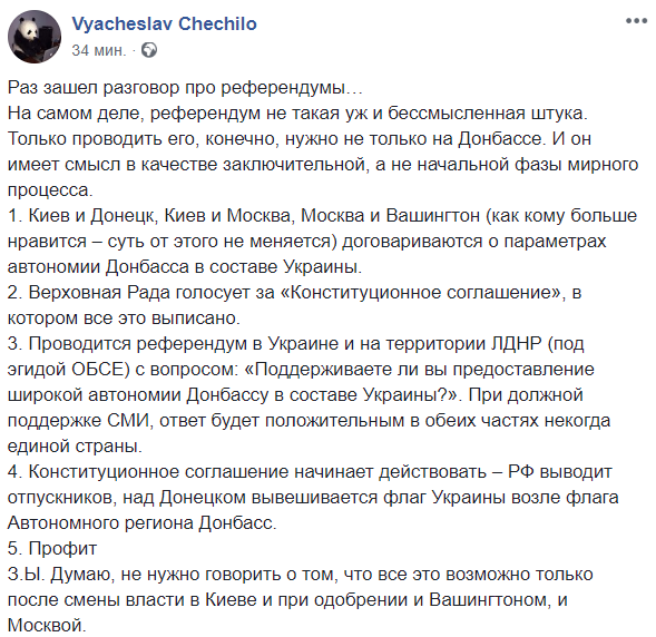 В тоже время, журналист Вячеслав Чечило решил обсудить параметры возможного плебисцита.