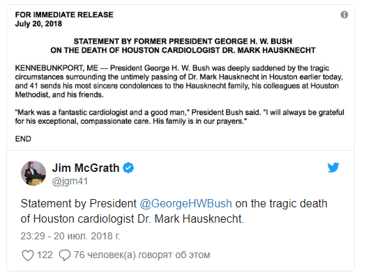 "Президент Джордж Буш-старший глубоко опечален трагическими обстоятельствами, связанными с несвоевременным уходом из жизни доктора Марка Хаускнехта и выражает свои самые искренние соболезнования его семье, коллегам и друзьям", – сообщил в Twitter пресс-секретарь 94-летнего Буша-старшего Джим МакГрат.