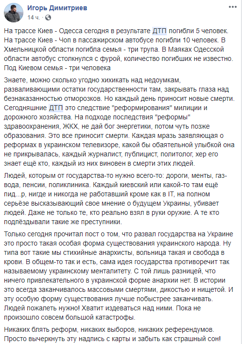 "Знаете, можно сколько угодно хихикать над недоумкам, разваливающими остатки государственности там, закрывать глаза над безнаказанностью отморозков. Но каждый день приносит новые смерти. Сегодняшние ДТП это следствие "реформирования" милиции и дорожного хозяйства. На подходе последствия "реформы" здравоохранения, ЖКХ, не дай бог энергетики, потом чуть позже образования. Это все приносит смерти. Каждая мразь заявляющая о реформах в украинском телевизоре, какой бы обаятельной улыбкой она не прикрывалась, каждый журналист, публицист, политолог, х...р его знает ещё кто, каждый из них виновен в смерти этих людей".