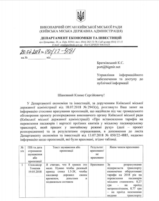 Все они были направлены в сторону увеличения стоимости проезда. Об этом на своей странице в соцсети пишет юрист и столичный активист Клим Братковский, который опубликовал в Facebook ответ на свой запрос столичным властям о том, какие предложения горожан были приняты во внимание.