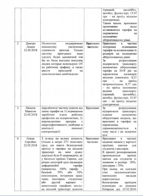 В частности, было учтено предложение советника начальника КП "Киевский метрополитен" Натальи Макогон, которая предложила, чтобы часть средств от повышения стоимости проезда пошла на повышение заработной платы людям рабочих профессий, а также внедрить программу экономии электроэнергии. Еще один житель столицы Дмитрий Лещев также полностью поддержал подорожание билета за проезд в общественном транспорте, но отметил, что нужно сделать более лояльной систему многоразовых проездных. Например, ввести проездной на день, несколько дней, неделю,