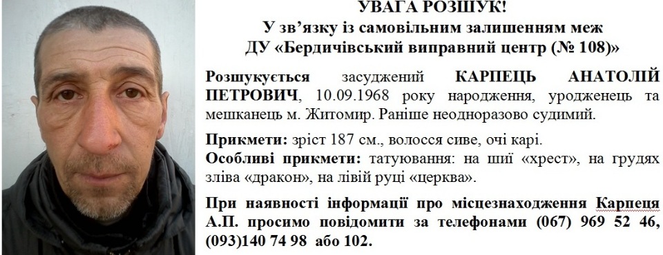 Анатолий Карпец, осужденный за умышленное нанесение тяжких телесных повреждений по ч.1 ст. 121 УК Украины самовольно оставил место выполнения исправительных работ в Романовском районе Житомирской области 23 июля около 11:00. Заключенный объявлен в розыск.