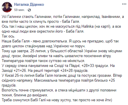По словам Диденко, циклон "Галина" просто так не хочет уходить из Украины. За месяц он не маскируется под Halinkа, в Украине его давно крестили Баба Галя.
